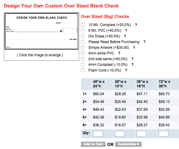 Please select the material you would to use for your oversize large charity check located above the pricing. If no material is selected than your oversize big check will be mounted on 4mm white PVC at no additional cost. If you would like to use something else besides PVC then please select the appropriate upgrade such as dry erase, Foam Core, or Coroplast as the material for the oversize check.